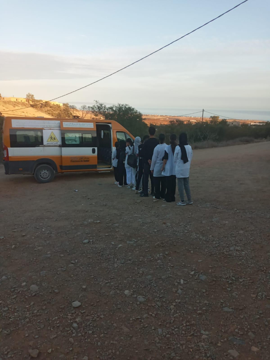 Der Verein „Ouladyakhlef für Entwicklung e.V.“ hat ein Transportunternehmen beauftragt, das täglich 20 Kinder sicher zur Schule und zurückfährt. Diese Maßnahme entlastet mehr als 80 Familien und unterstützt rund 250 Menschen in der Region, darunter auch 40 Grundschulkinder und 6 Kindergartenkinder im Dorf.