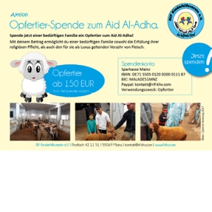 Zum Aid al Adha möchte der RIF Kinderhilfsverein seinen muslimischen Mitgliedern, Sponsoren und Freunden ganz herzlich gratulieren. Wir danken euch für eure tatkräftige Unterstützung und eure Treue - sie ist die Basis des Vereins. Euer Vertrauen motiviert uns, noch mehr zu tun und die Projekte auszubauen. Damit erreichen wir immer mehr Bedürftige und streuen den Samen unseres Glaubens: die Barmherzigkeit. Hierfür danken wir euch sehr.